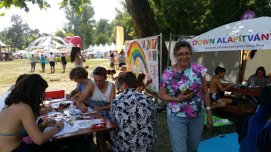 Nagyon jó helyen volt a Civil sziget, és azon belül is a Down Alapítvány tábora. Körülöttünk a hatalmas platánfa árnyékában hűsöltek, pihentek a fiatalok, és szó szerint a nap bármely szakában özönlöttek, hogy részt vegyenek programjainkon.
