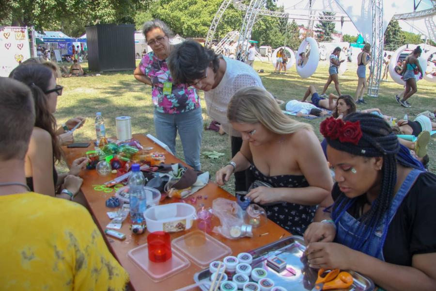 Hat nap alatt hat óriásfestményt készítettünk integráltan a szigetlakó turistákkal együtt. Közben kézműves foglalkozás is folyt, virágfűzért, újrahasznosított party-kellékeket készítettünk: PET palackból fülbevalót, nyakláncot, karkötőt; valamint pavilonunknál egész nap volt pólófestés, mandala színezés, arc- és testfestés.