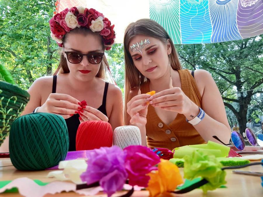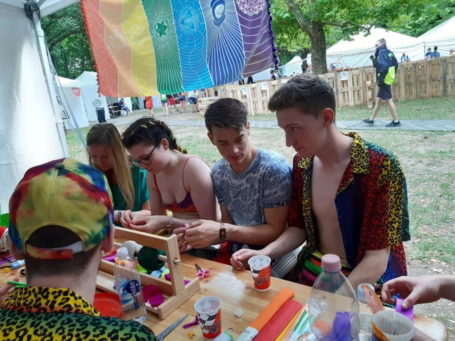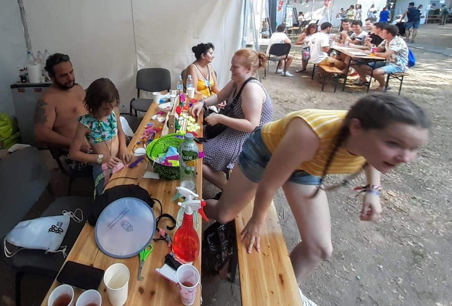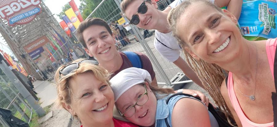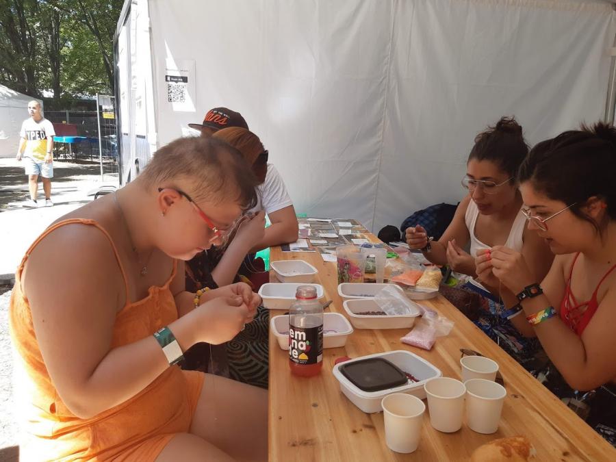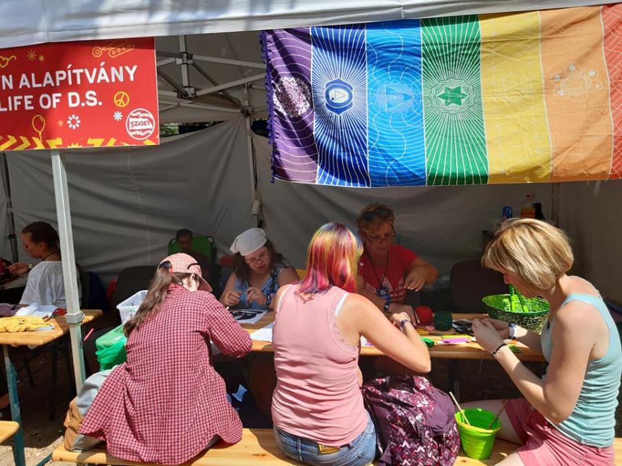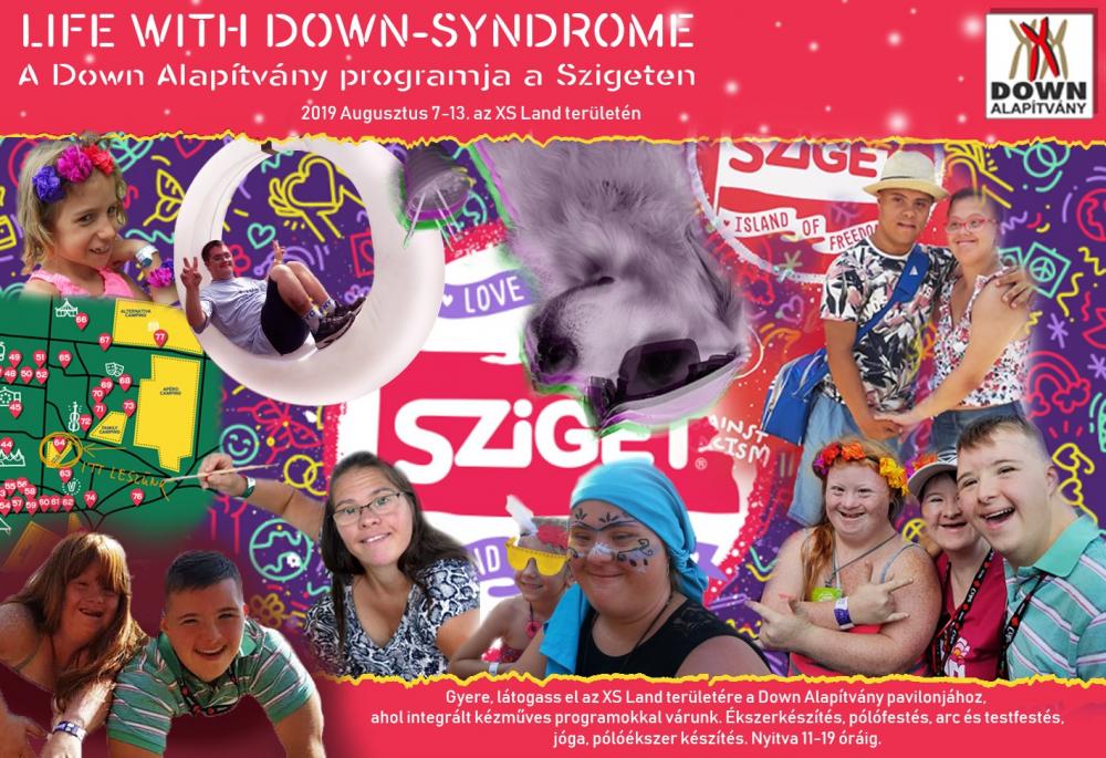 Idén is szerepelt a Down Alapítvány a szigeten Life with Down-syndrome című programjával. Egy héten keresztül minden nap integrált kézműves programokkal vártuk a szigetlakókat az XS Land területén. Gyöngyöt fűztünk, PET palackból fülbecalót, virág fejdíszt, nyakláncot, kardíszt, és pólóékszereket készítettünk. Fotóterápiás rejvény megfejtéséért, és mandala színezésért is lehetett nálunk pecsétet kapni. Volt arcfestés, testfestés, és ami a legtöbb turistát odavonzotta, pólófestés. Az XS Landen mozgássérültekkel, vakokkal és gyengénlátókkal, siketekkel együtt folytak programjaink. Magunk is kipróbálhattuk a vak labirintust, vak pinpongot, mászófalat szemkötővel. Jelbeszédet tanulhattunk, kerekesszékkel akadálypályán próbálkozhattunk. Nagy élmény volt megtapasztalni a különböző érzékszerv kiesésével végzett tréfás gyakorlatokat. "Munkaidőnk" lejárta után a Sziget többi érdekes és színes programján is részt vehettünk. Hatalmas élményt jelentett számunkra a cirkusz magas színvonalú előadása, és a Lumináriumba is lehetőségünk volt bejutni. Down-szindrómás segítőink is nagyon jól feltalálták magukat. Önfeledten fotózkodhattak, festhettek cipőt, és bulizhattak a sziget elfogadó közönségével.