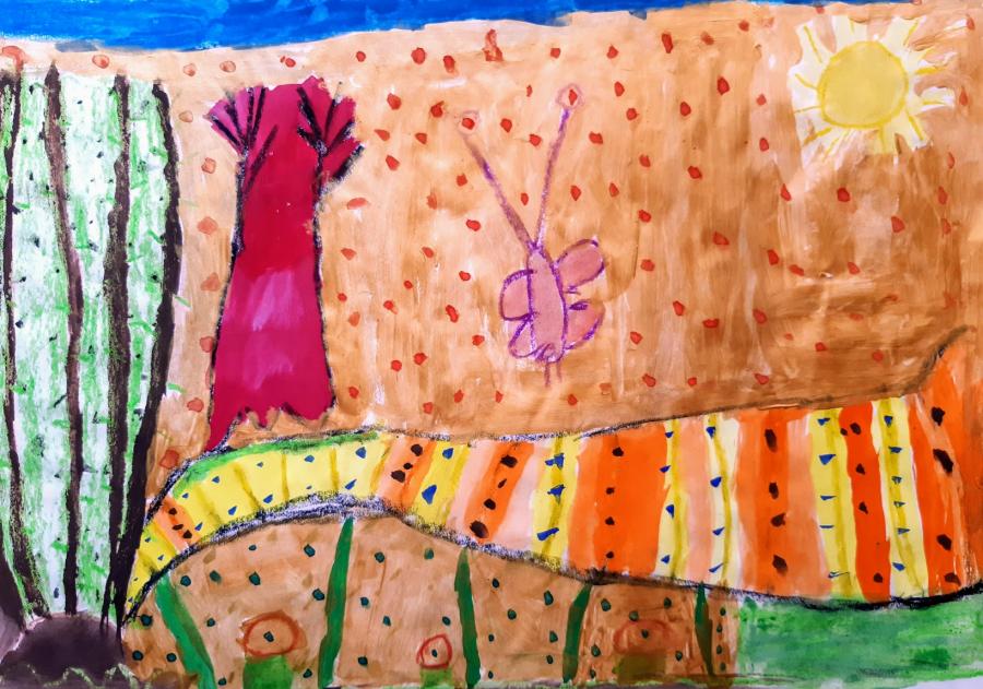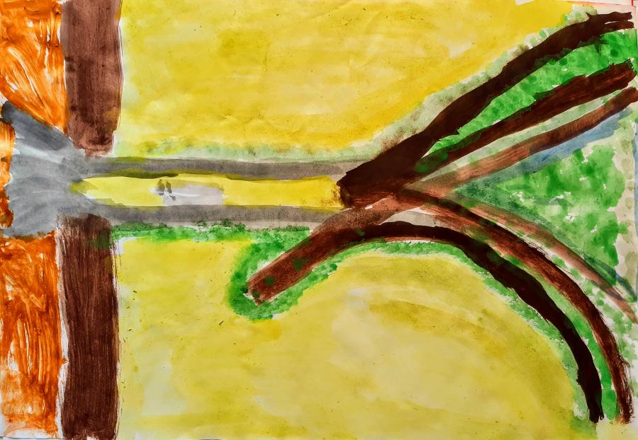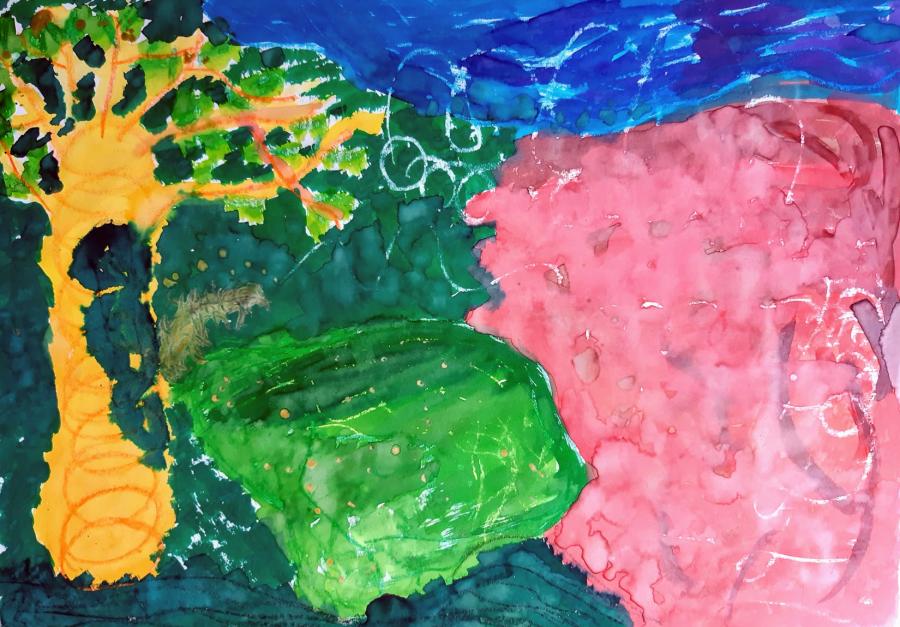 Olajpasztellel rajzoltuk elő, rá akvarell festék került, így az olajpasztellel rajzolt részek fedetlenül maradtak. A festéshez erdős meséket olvastunk fel.