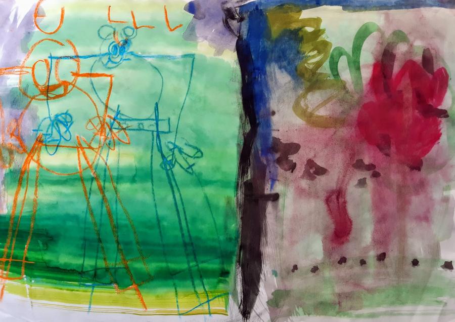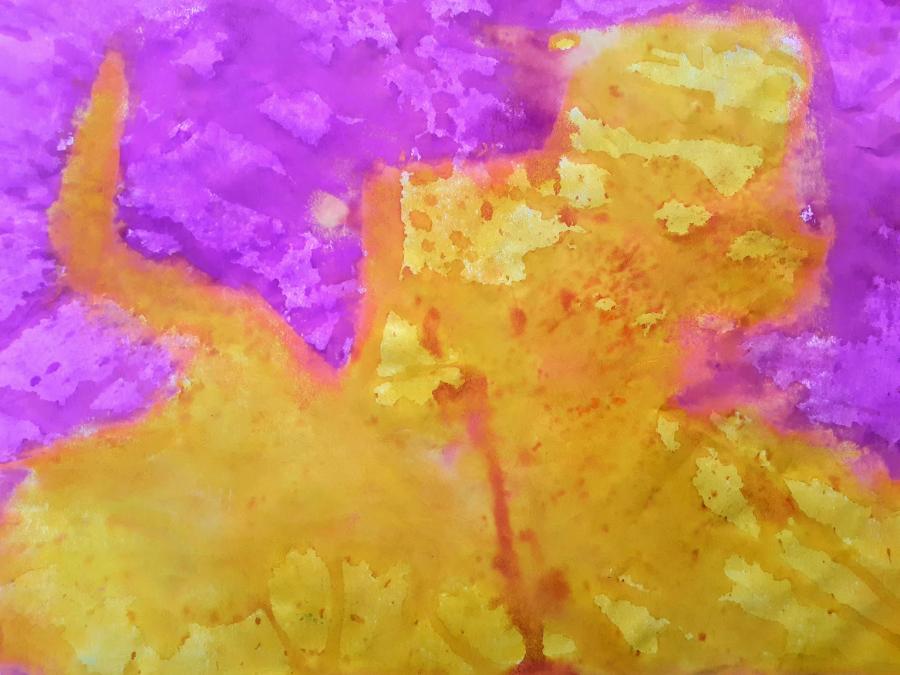 Szóró technikával papírra alapot folyattunk, ez az úgynevezett asszociációs festés. Növénypermetezőbe folyékony festéket teszünk, rápermetezzük különböző színekkel, és kedvükre folyathatják a papírt mozgatva. A kirajzolódott alakzatokat dolgoztuk ki aztán többféleképpen.