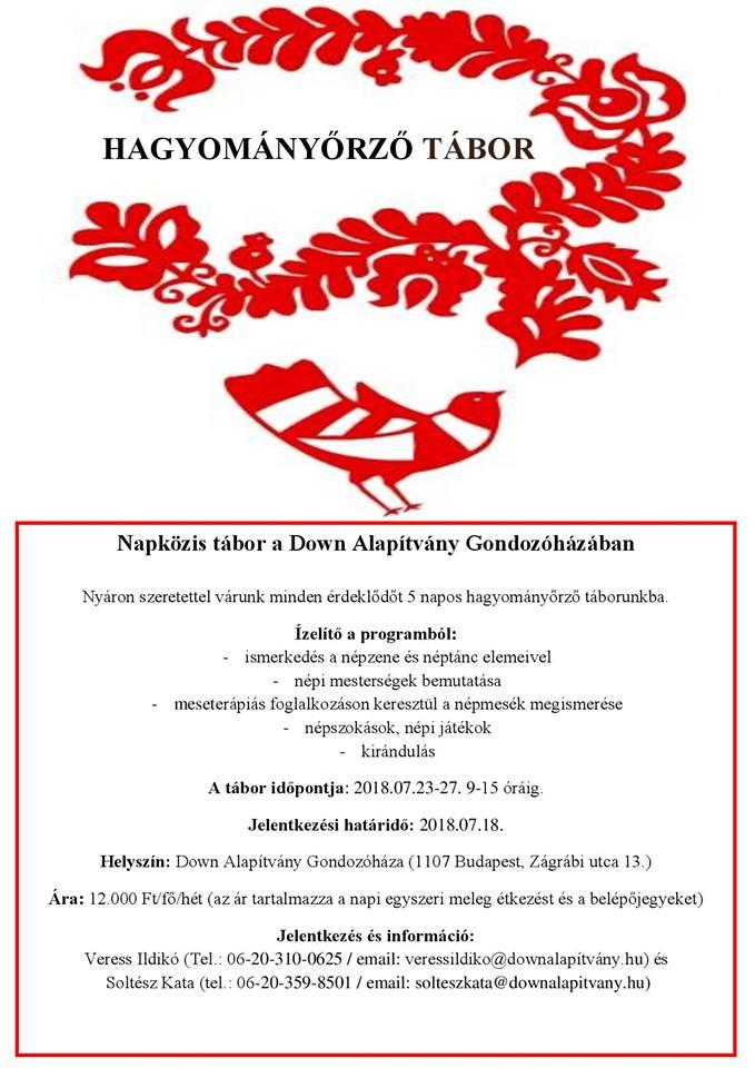 Hagyományőrző táborunkban megismerkedhettek: a népzene és néptánc elemeivel, népszokásokkal, népi játékokkal, népi mesterségekkel, meseterápiás foglalkozáson keresztül a népmesékkel. A tábor programjához tartozik továbbá kirándulás is.