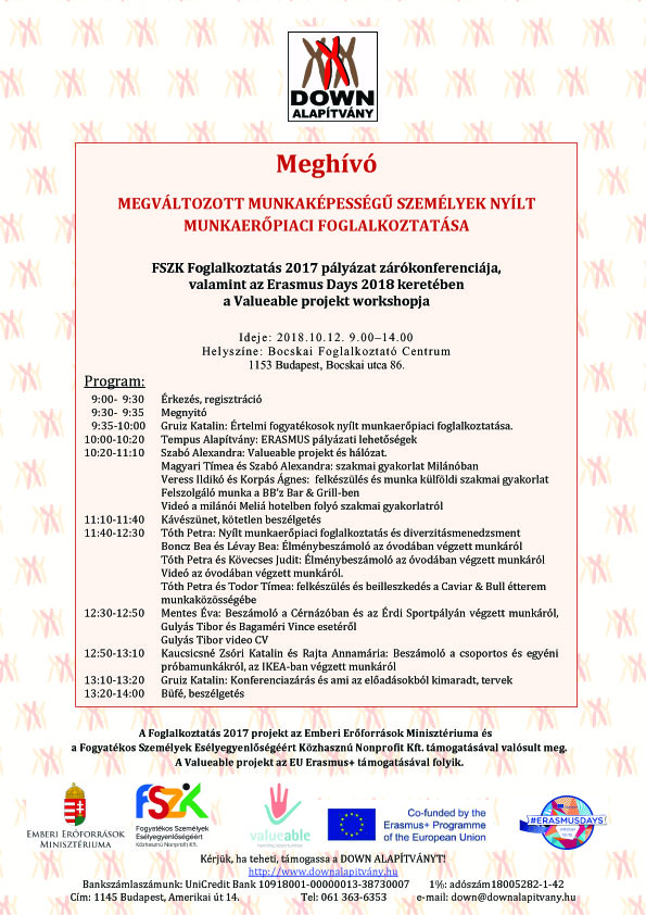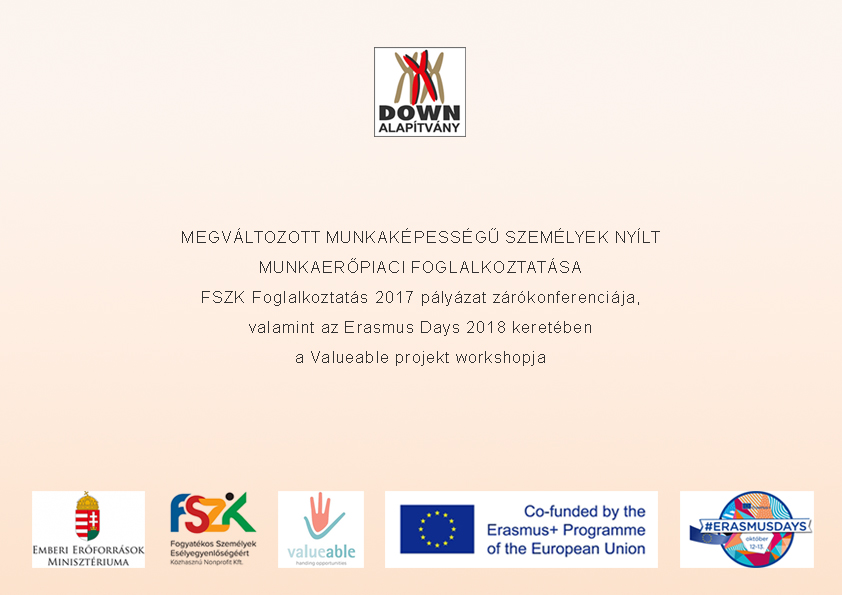 2018. október 12-én tartotta a Down Alapítvány "Megváltozott munkaképességű személyek nyílt munkaerőpiaci foglalkoztatása" címmel a Foglalkoztatás 2017 pályázat zárókonferenciáját, illetve a Valueable Hálózat workshopját az Erasmus Napok keretében.