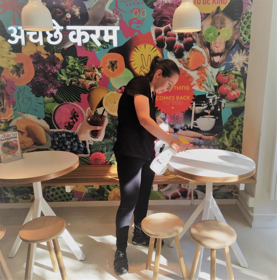 Az étteremben nagyon fontos, hogy tiszta és higiénikus legyen az asztal, amiről a vendég eszik. Ezért a takarítói munkába is belekóstolhatnak a gyakornokok, az asztalok fertőtlenítése és tisztítása is az ő feladatuk. Jó munkát kívánunk!