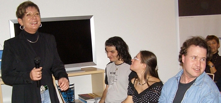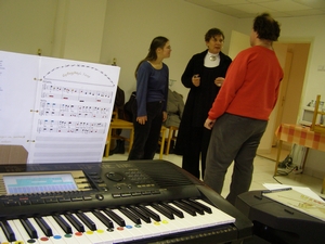 Tanácskozás a próbán: Janzsó Cili és Erdős Balázs Katona Klárival tervezget | Szepesi Ricsi a trió billentyűse | Balázs bekonferálja az első számot |