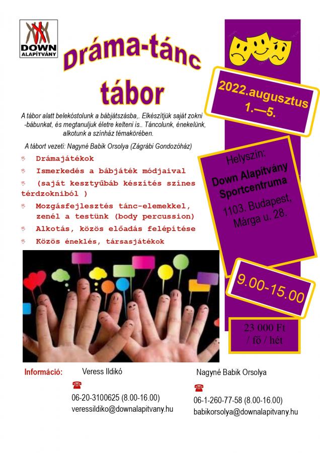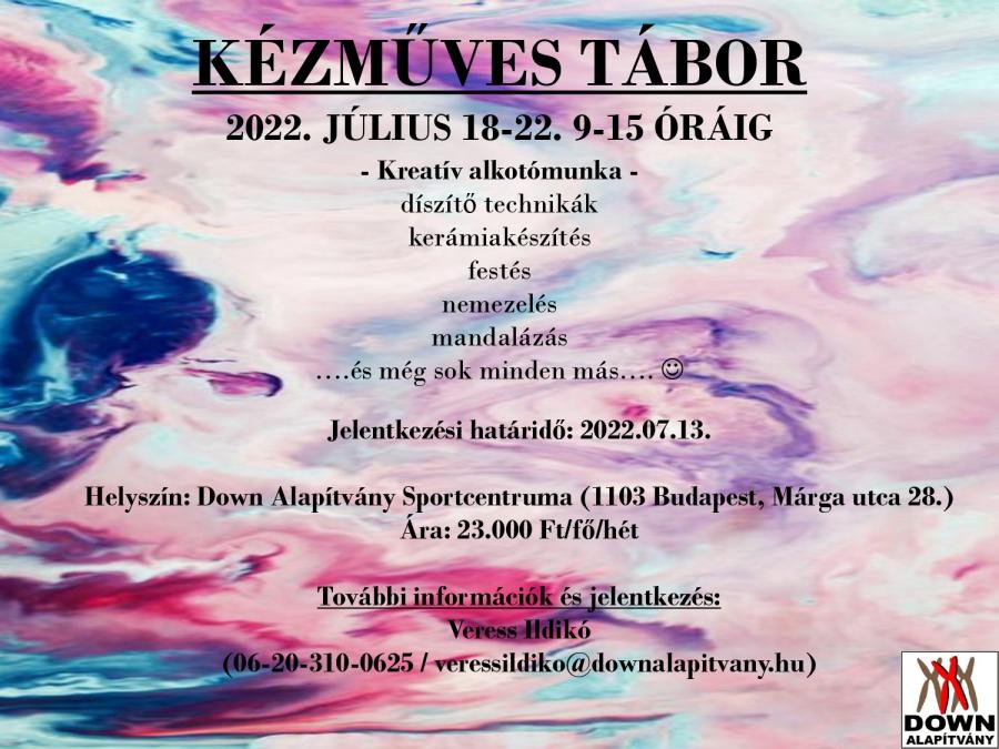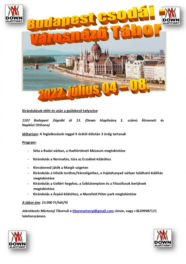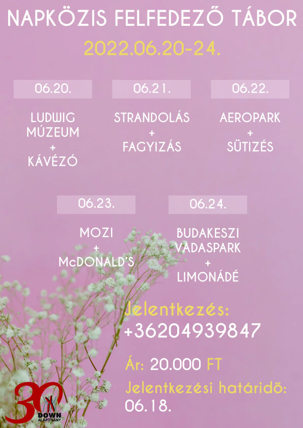 A Down Alapítvány idén is számos nyári táborral készül az érdeklődőknek. Táboraink 5 napos napközis táborok, melyekre bárki jelentkezhet, csaldban élők, iskolások, más szervezetekhez tartozók. Elsősorban enyhe-, és középsúlyos értelmi fogyatékos fiataloknak, felnőtteknek ajánljuk (14-99 éves korig).