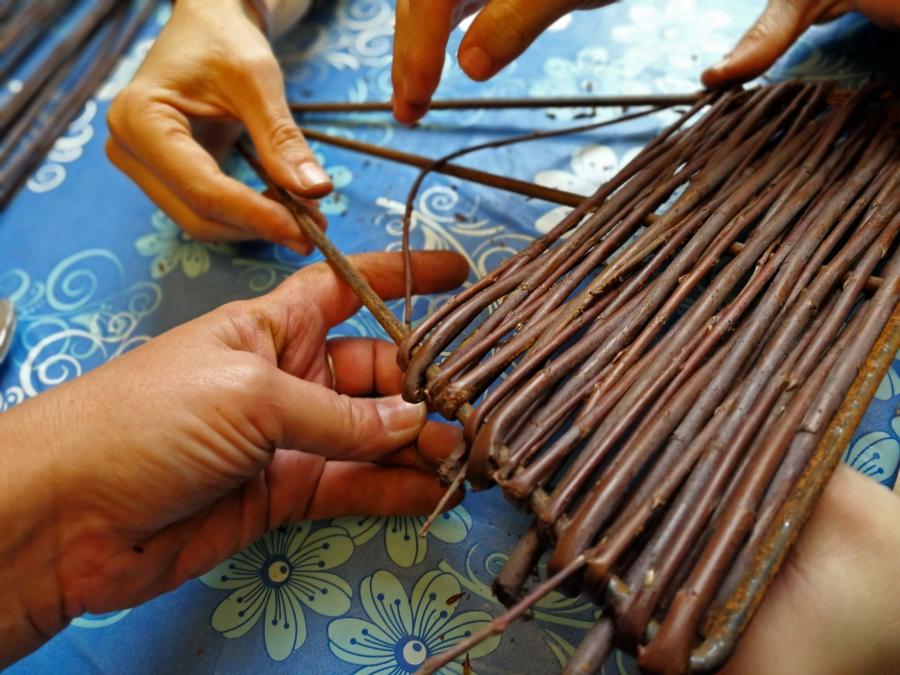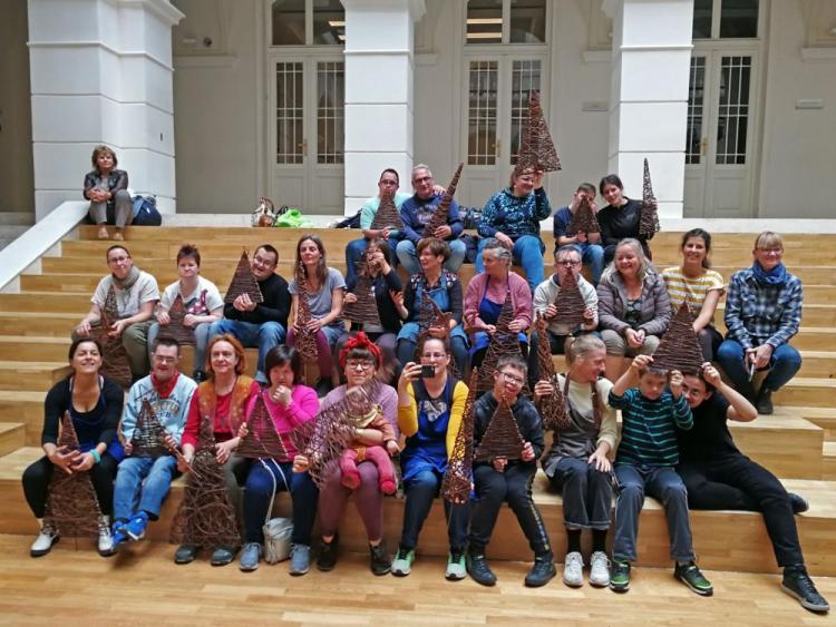 A képeken: a Fotó és művészetterápiás foglalkozás résztvevői fonott karácsonyfadíszt készítenek a Hagyományok Háza kosárfonó műhelyének vendégeként.