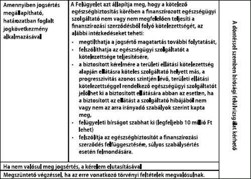 - Az Egészségbiztosítási Felügyelet az egészségbiztosítás hatósági felügyeletéről szóló 2006. évi CXVI. törvény hatályba lépése – azaz 2007. január elseje – után történt ellátásokkal kapcsolatos panaszbejelentésekkel foglalkozik. A Felügyelet eljárása igen hatékony. Az érintett az Egészségbiztosítási Felügyelethez fordulhat panaszával amennyiben a kötelező egészségbiztosítás alapján egészségügyi szolgáltatást vett (volna) igénybe és ennek során nem az elvárt ellátási minőséggel találkozott, így például