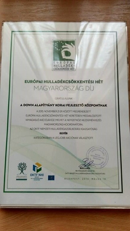 A Nemzeti Hulladékgazdálkodási Igazgatóság által szervezett Európai Hulladékcsökkentési Héten idén a Down Alapítvány Korai Fejlesztő Központja is szerepelt, nem is akárhogyan. Projektjükkel az egyéb szervezeti kategória első helyét szerezhették meg. A projektre való felhívás még 2015 szeptemberében érkezett be az intézménybe. Olyan eseményeket vártak, amely a hulladékkeletkezés megelőzésével, az újrahasznosítással és hasonló témákkal foglalkozik. A Korai Fejlesztő Központ november 19-én tartott egy speciális csoportos foglalkozást, ahol a gyerekekkel együtt készítettek „szemétből” (WC papír guriga, pálcikák) fejlesztő játékokat.